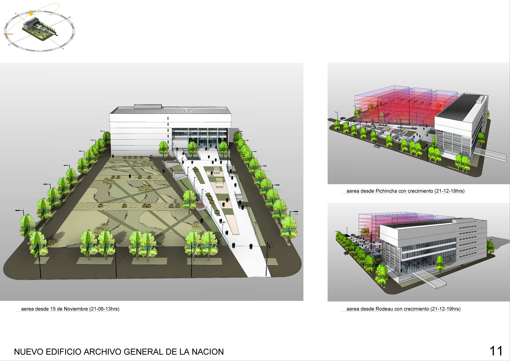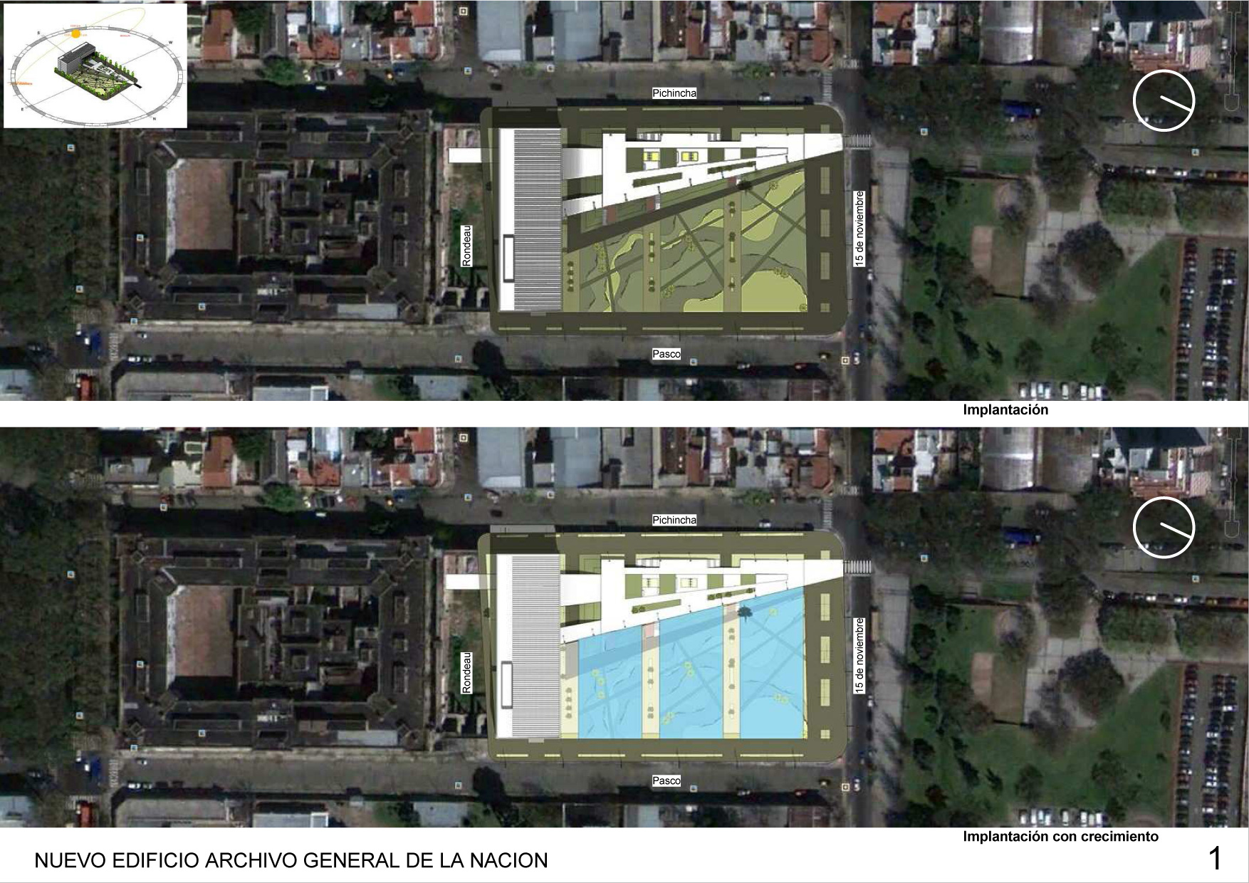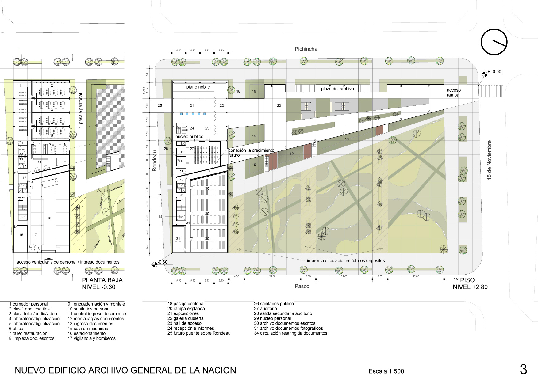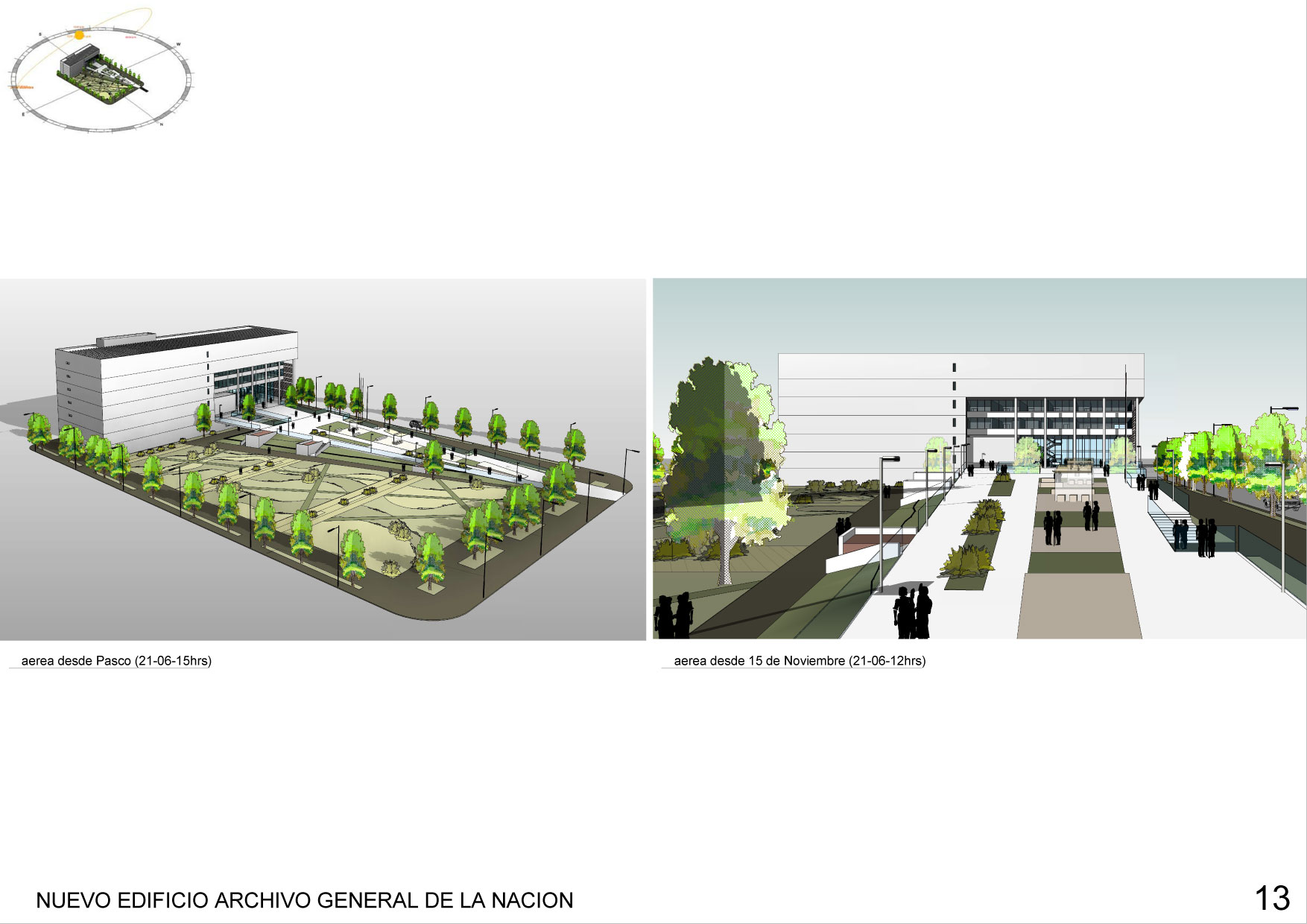 Proponemos entonces crear un gran paseo público utilizando la calle Pichincha como enlace y eje de vinculación entre el parque Vuelta de Obligado, el Garraham, el Archivo General, la ex Carcel de Caseros y el Parque Florentino Ameghino. Una gran Plaza del Archivo arranca en la Avenida 15 de Noviembre y a modo de explanada ó rampa de suave pendiente nos va conduciendo al Piano Nóbile del edificio de doble altura visualizando como telón de fondo el edificio de la ex Carcel con su arquitectura paradigmática, convertida en futuro Centro Cultural. De esta manera el contenido documental de las exposiciones se conecta con el sitio real, donde las vistas tanto de la Ex Carcel como del entorno inmediato se convierten en parte de los elementos expuestos. Se prevé la prolongación de la rampa, con un puente que cruce la calle Rondeau como extensión del hall de acceso del Archivo para continuar el circuito