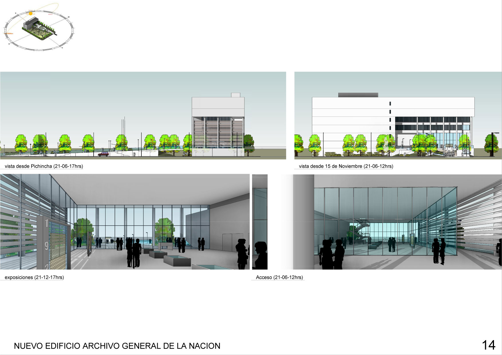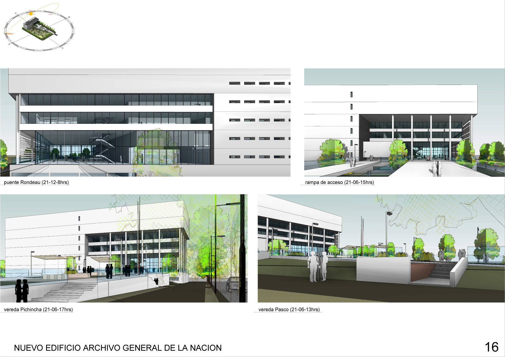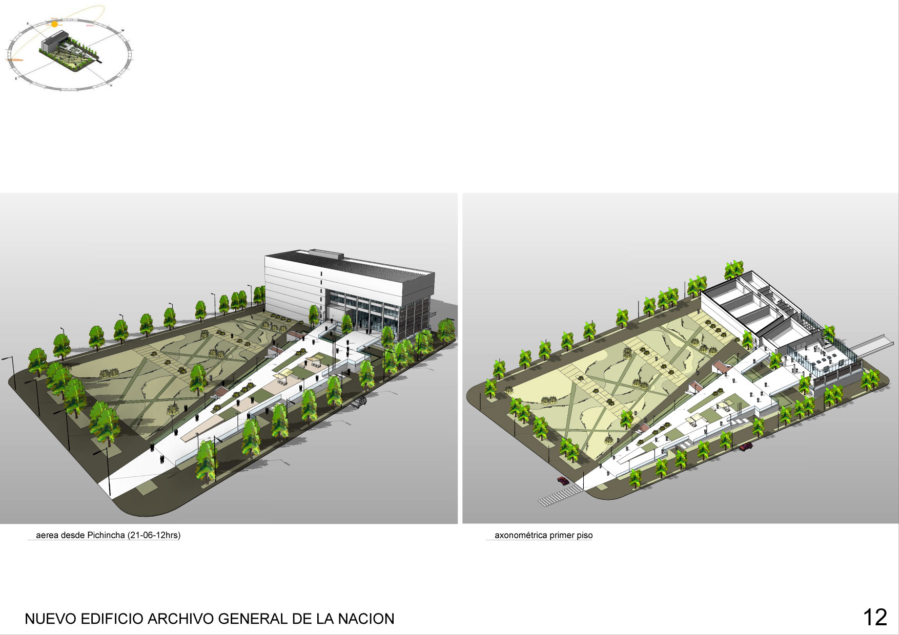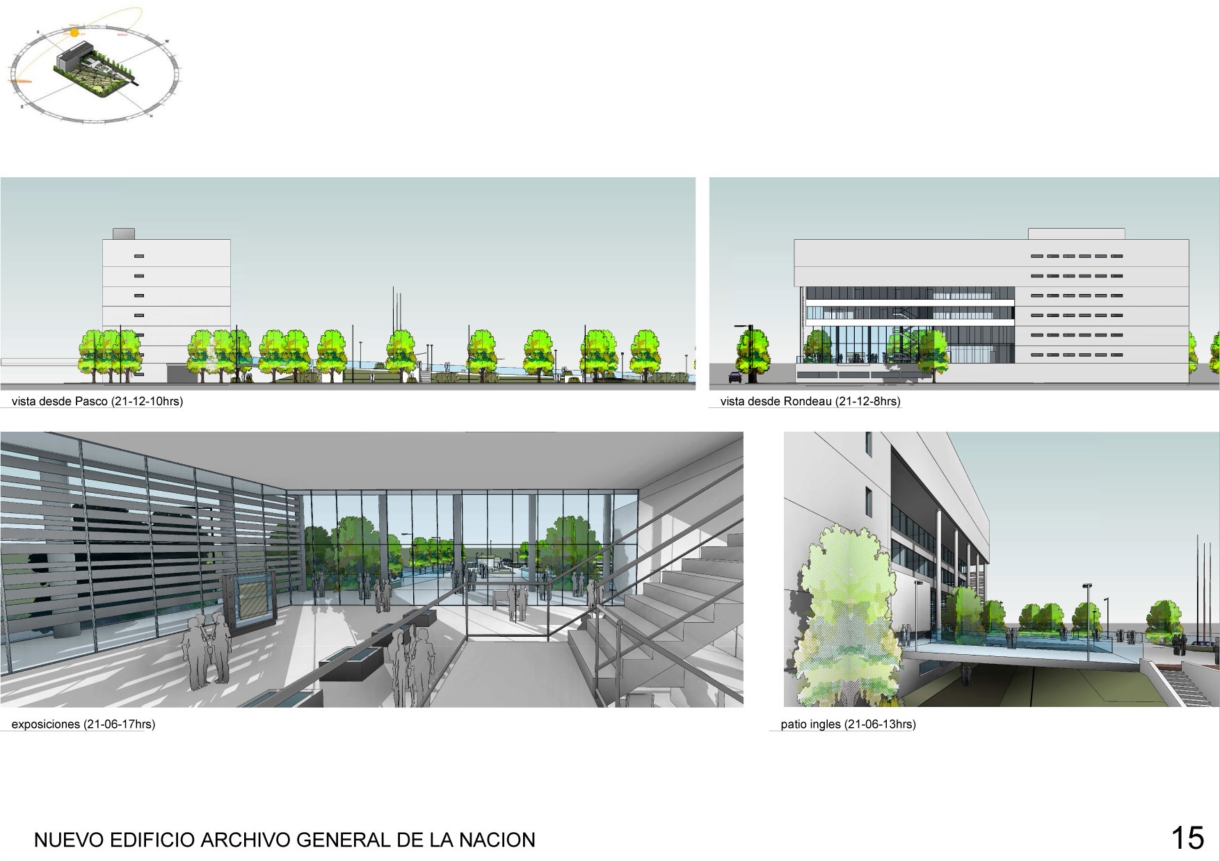 Proponemos entonces crear un gran paseo público utilizando la calle Pichincha como enlace y eje de vinculación entre el parque Vuelta de Obligado, el Garraham, el Archivo General, la ex Carcel de Caseros y el Parque Florentino Ameghino. Una gran Plaza del Archivo arranca en la Avenida 15 de Noviembre y a modo de explanada ó rampa de suave pendiente nos va conduciendo al Piano Nóbile del edificio de doble altura visualizando como telón de fondo el edificio de la ex Carcel con su arquitectura paradigmática, convertida en futuro Centro Cultural. De esta manera el contenido documental de las exposiciones se conecta con el sitio real, donde las vistas tanto de la Ex Carcel como del entorno inmediato se convierten en parte de los elementos expuestos. Se prevé la prolongación de la rampa, con un puente que cruce la calle Rondeau como extensión del hall de acceso del Archivo para continuar el circuito
