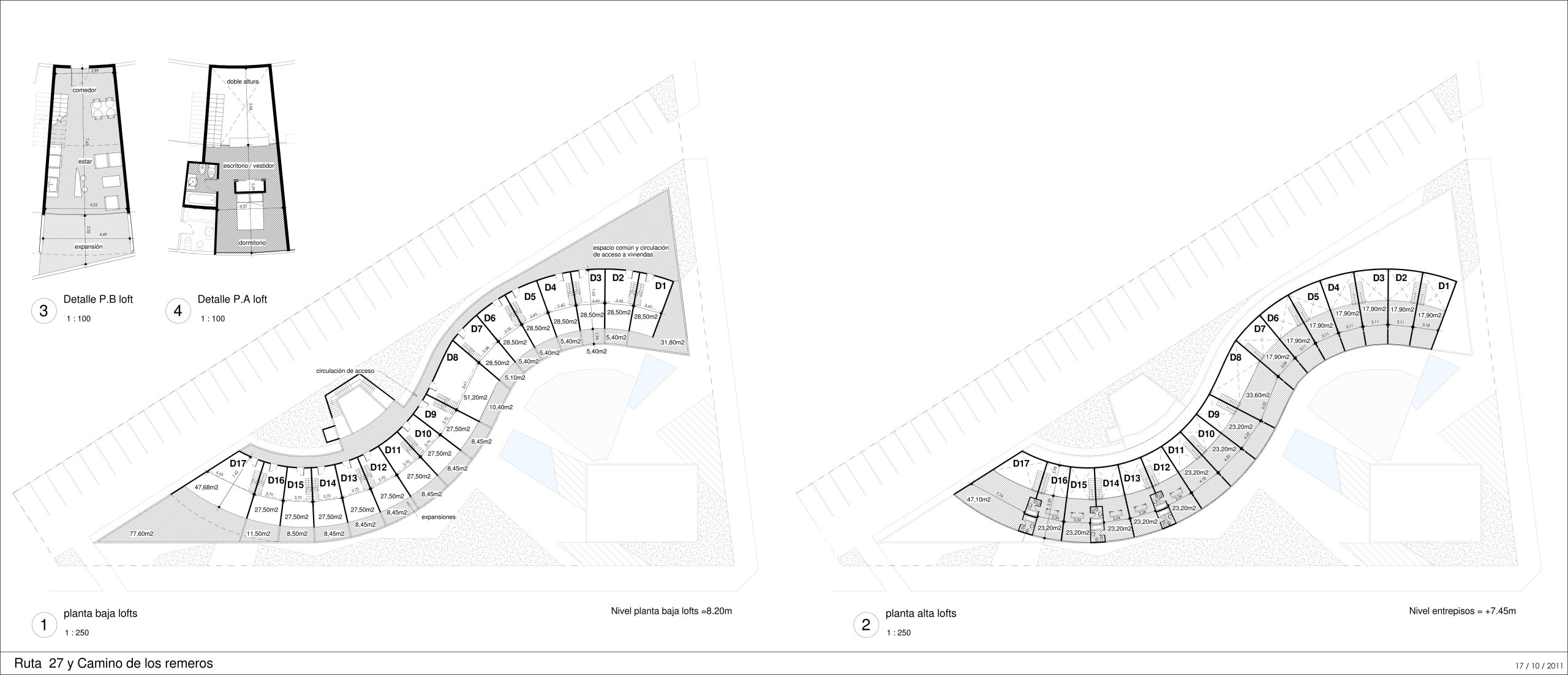 La propuesta se basa en una hilera de sinusoidal de pequeños locales o estudios tipo loft, abrazando el terreno hacia las avenidas de mayor tránsito.