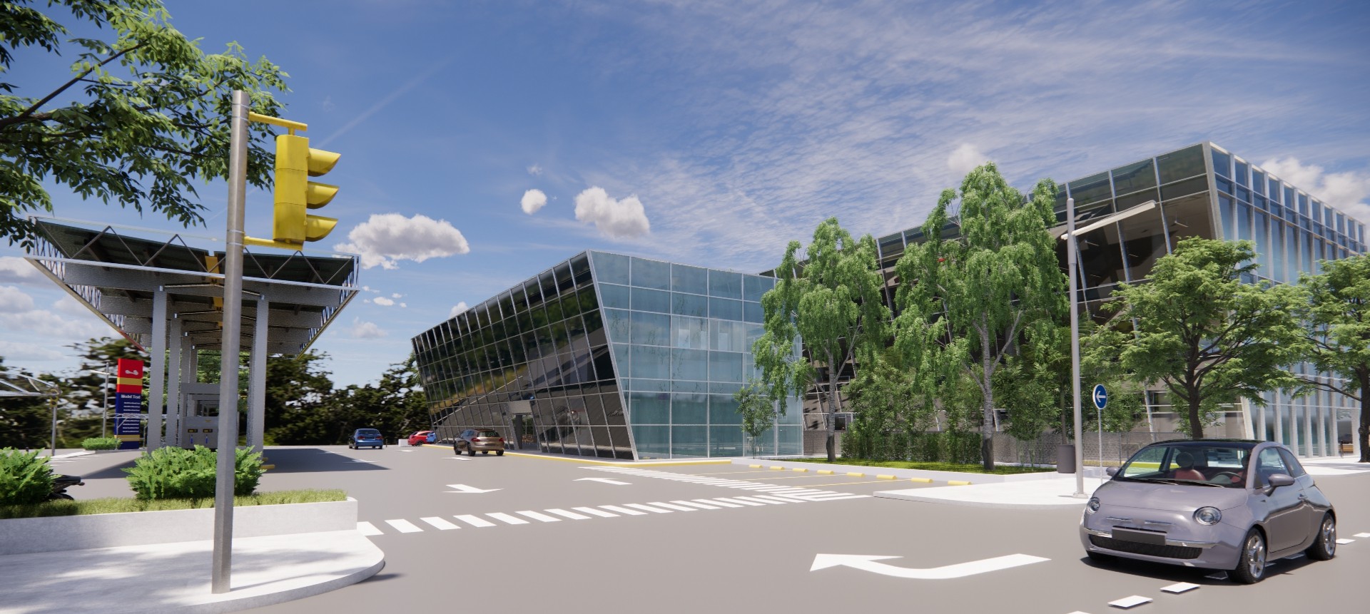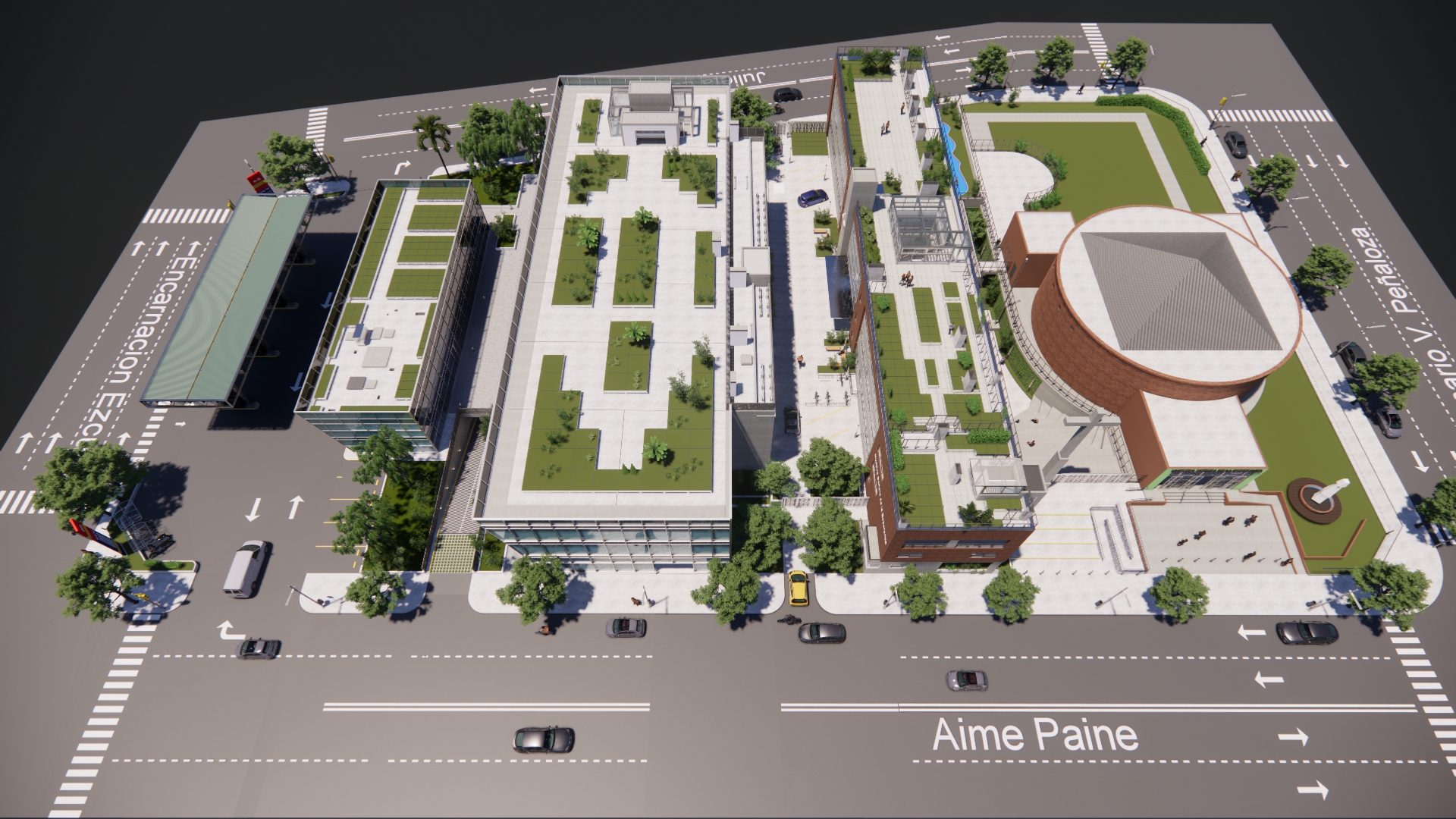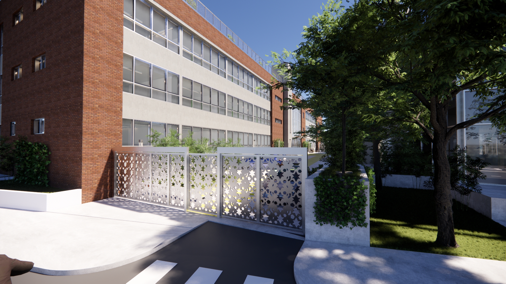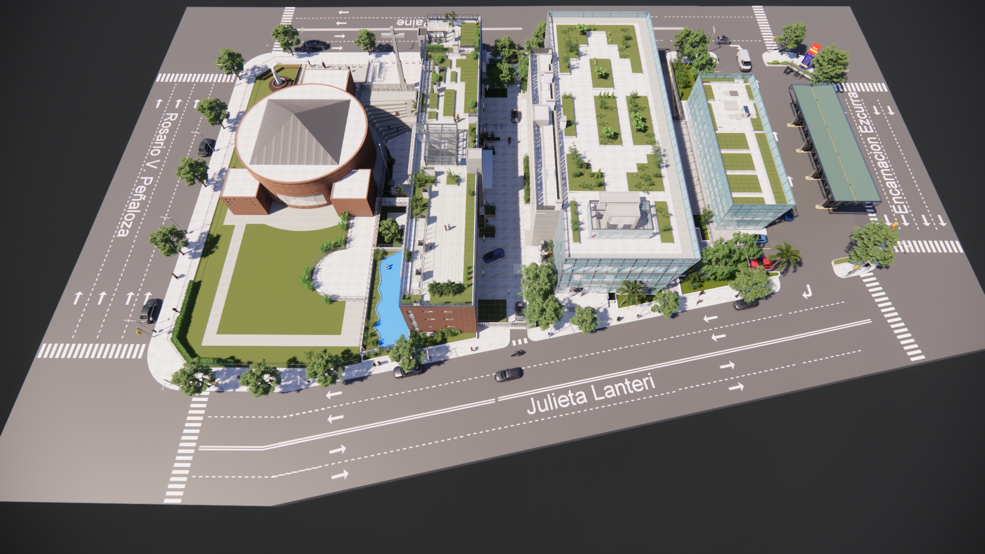 - Oficinas: es un edificio que tiene 2 ingresos, uno público por la plaza seca y otro privado por la calle Julieta Lanteri. En el interior de la planta baja hay un salón exposición con áreas de servicio comunes. En el 1ero y 2do piso se desarrolla un espacio abierto de oficinas con áreas de servicio (sanitarios y office). A demás el edificio tiene una terraza jardín con sanitarios en la azotea transitable y un nivel de subsuelo con cocheras y área técnica.