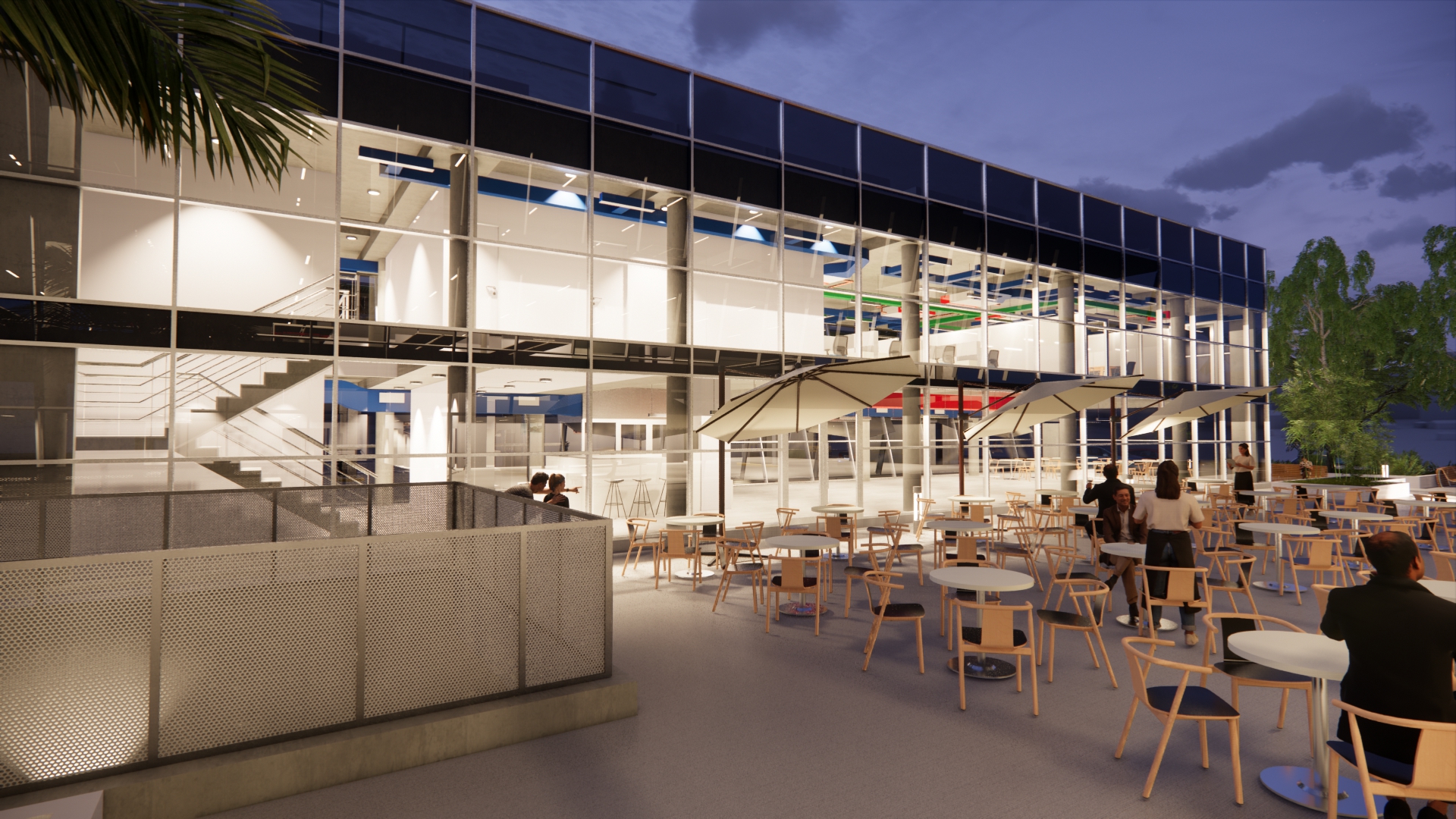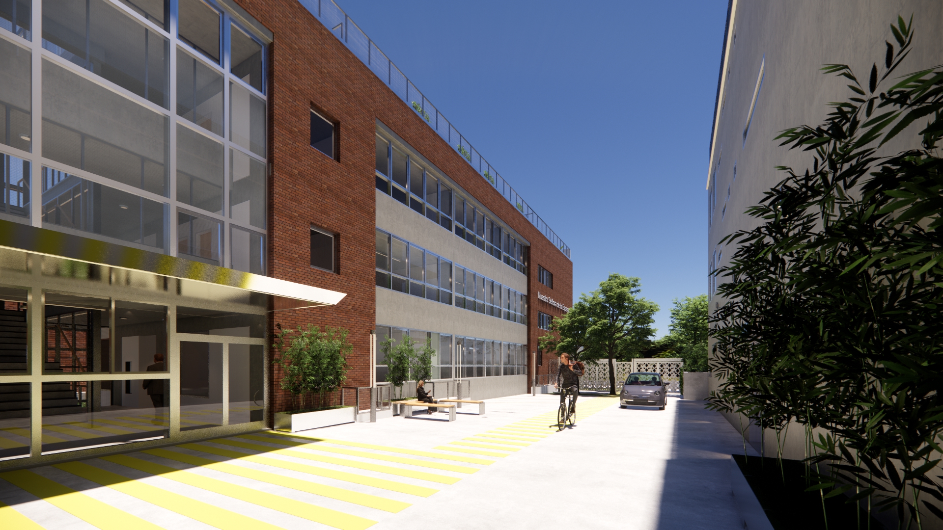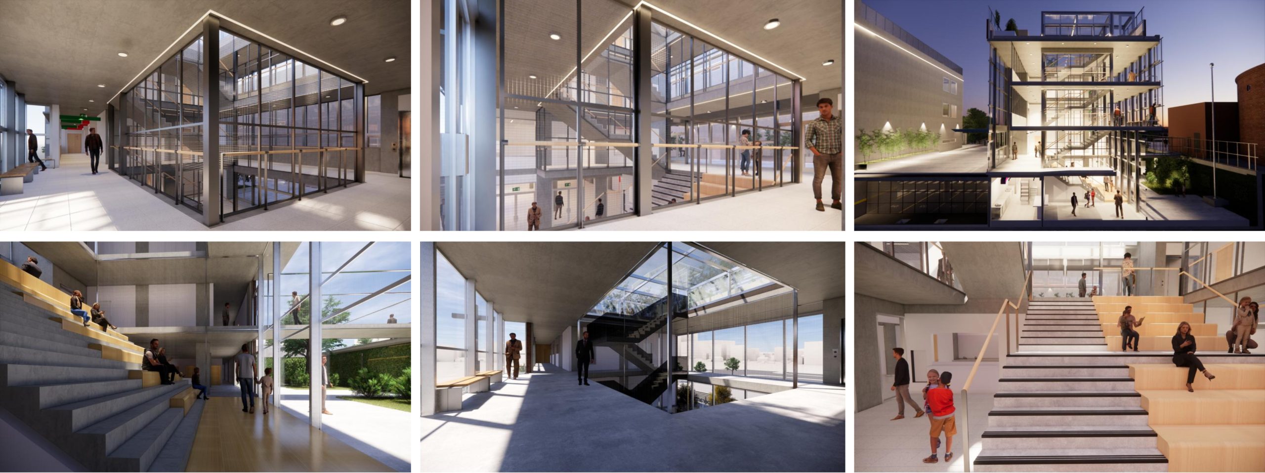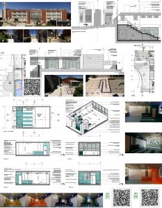 - Oficinas: es un edificio que tiene 2 ingresos, uno público por la plaza seca y otro privado por la calle Julieta Lanteri. En el interior de la planta baja hay un salón exposición con áreas de servicio comunes. En el 1ero y 2do piso se desarrolla un espacio abierto de oficinas con áreas de servicio (sanitarios y office). A demás el edificio tiene una terraza jardín con sanitarios en la azotea transitable y un nivel de subsuelo con cocheras y área técnica.