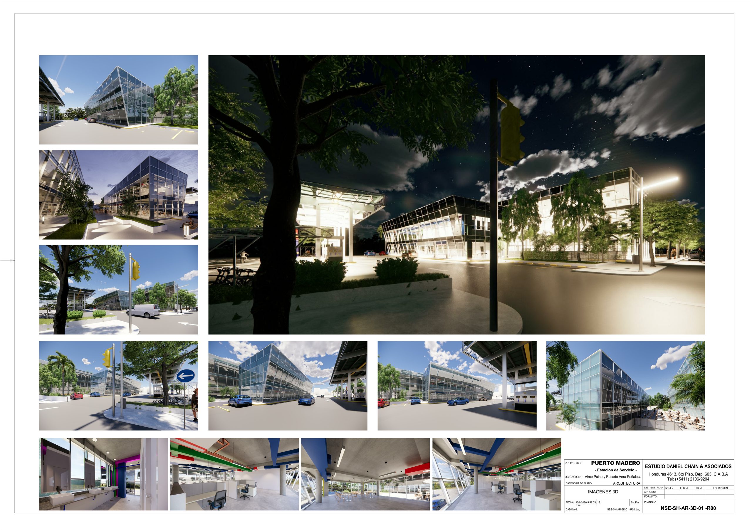 - Shop y Estacion de servicio: el shop da apoyo al área de surtidores, brindando un sector de cafetería y sanitarios públicos en planta baja. El 1er piso es privado, hay un sector destinado a oficinas, sanitarios y vestuarios privados. La terraza jardín es de uso técnico.