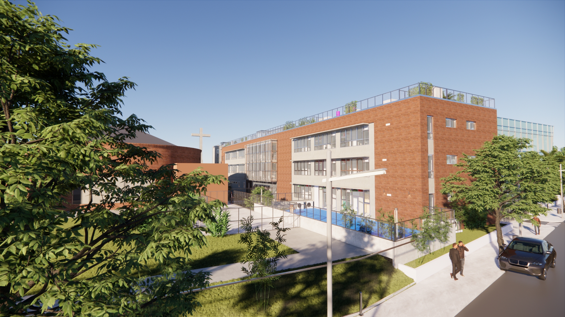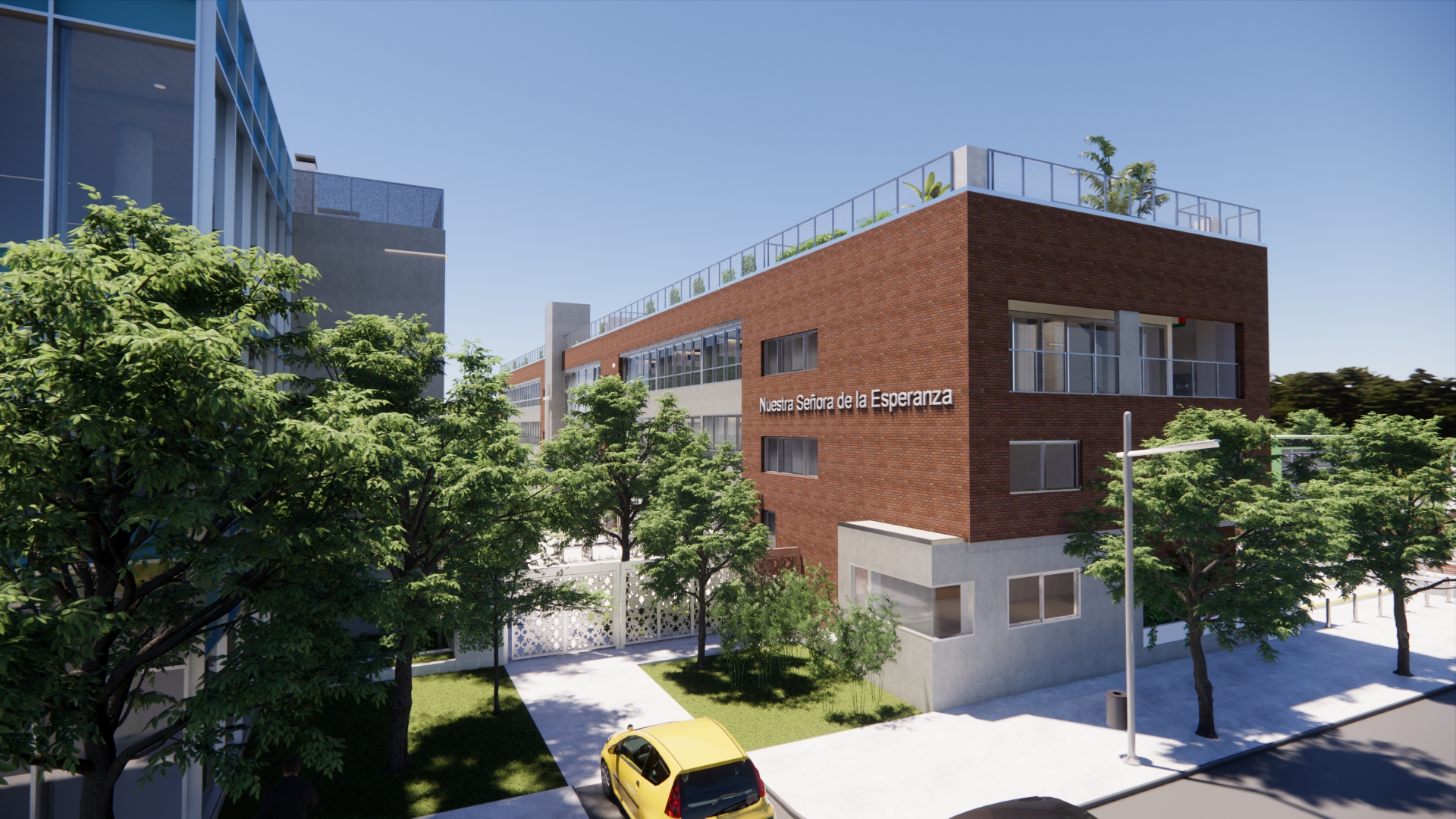 - Edificio escolar: un edificio que se ingresa por una plaza seca que interactúa con las 2 calles con acceso peatonal y vehicular. En la planta baja se encuentra un hall con cuádruple altura donde se desarrolla la escalera principal del edificio. Se desarrollan sectores administrativos, área de Caritas y las aulas del jardín con una expansión al aire libre. En el 1er piso se encuentran las aulas de primaria y dormitorios estudio para el sector privado de la iglesia. En el 2do piso hay aulas, laboratorios, talleres y un salón comedor destinado al sector privado. Hay una terraza jardín que se despliega en toda el área del edificio que es recreativa y otra zona de uso privado. El edificio también tiene un subsuelo con expansión que se vincula con el exterior. En este nivel se desarrolla el comedor / salón de actos para 260 sillas, el área de biblioteca y también la cocina y áreas de servicio (depósitos, sala de máquinas, vestuario).