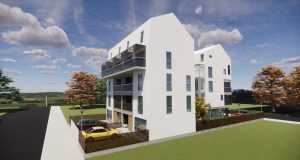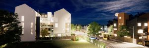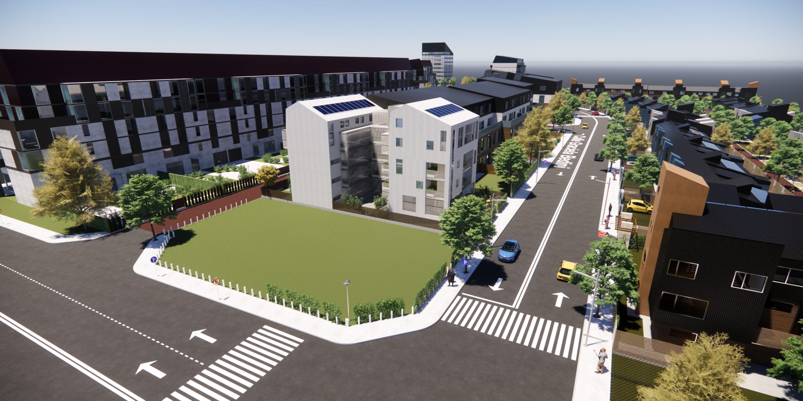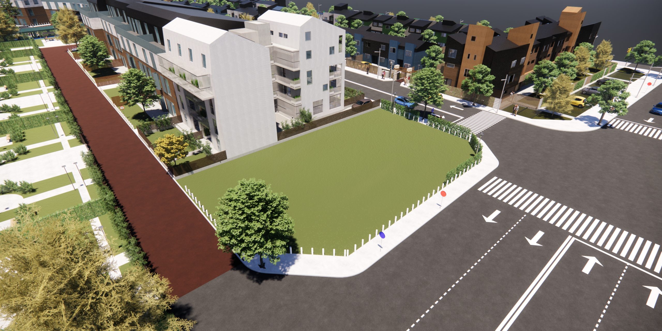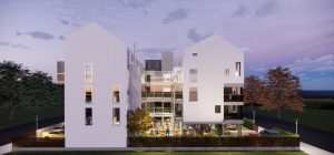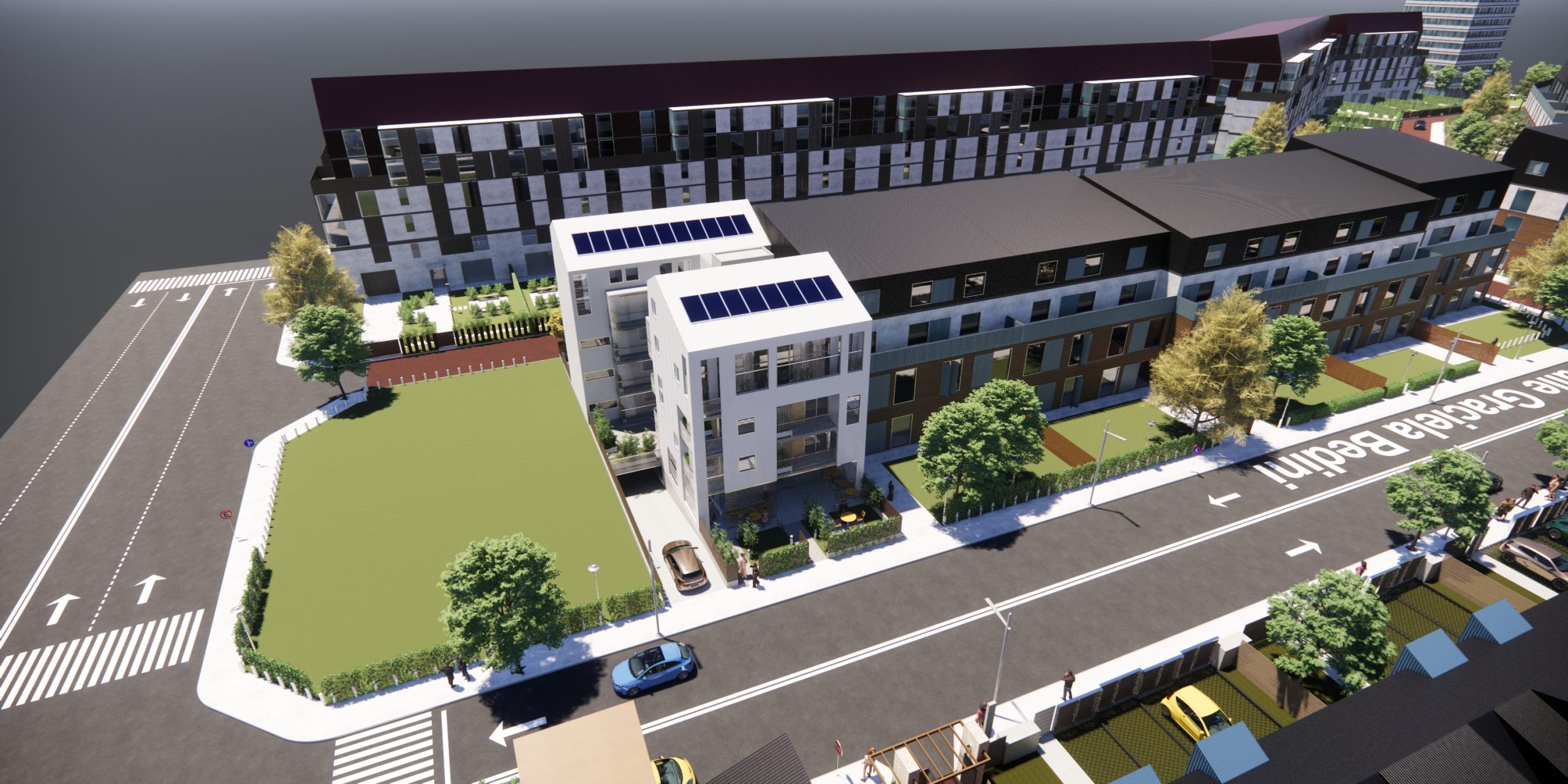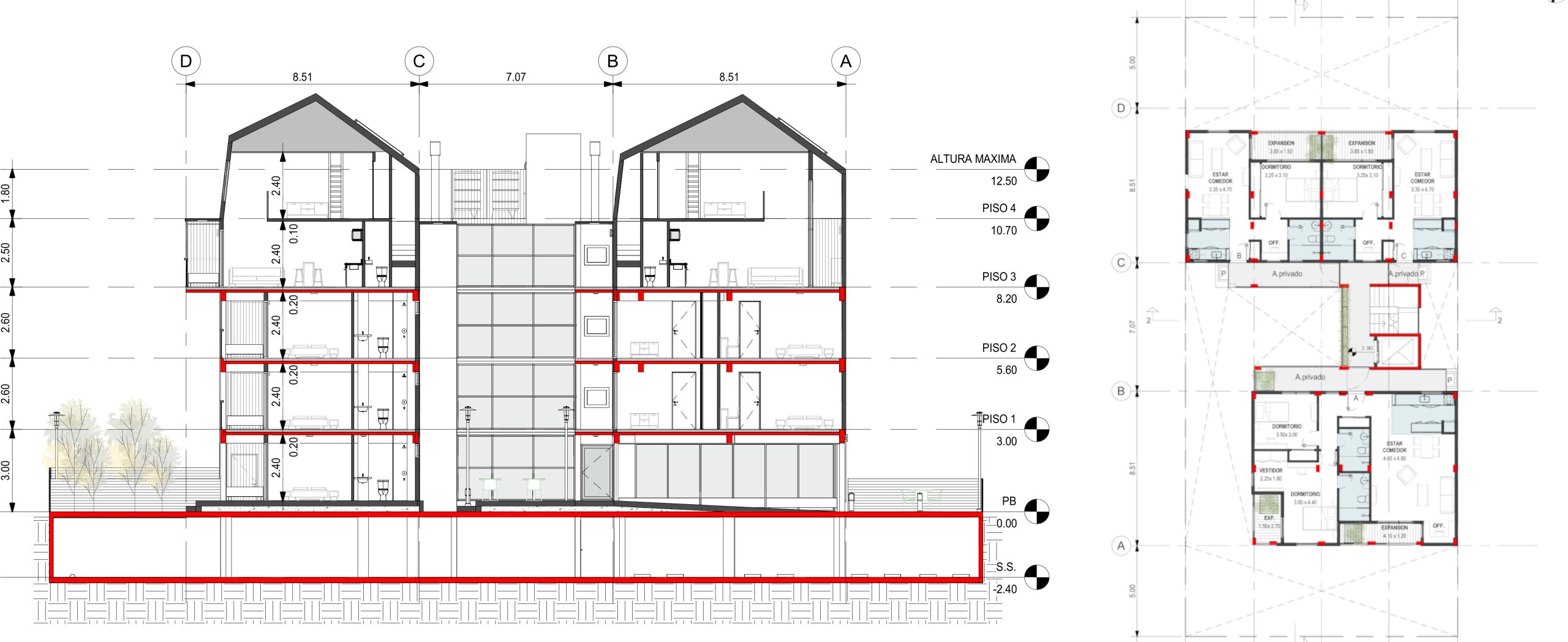 En el bloque del frente se ocupan solo 3 de estos módulos dejando libre las visuales hacia el cuerpo posterior que ocupa el ancho total del lote, aprovechando el abra que se produce para que, tanto el patio interior como las unidades que ventilan al mismo se beneficien con la buena orientación al Norte..