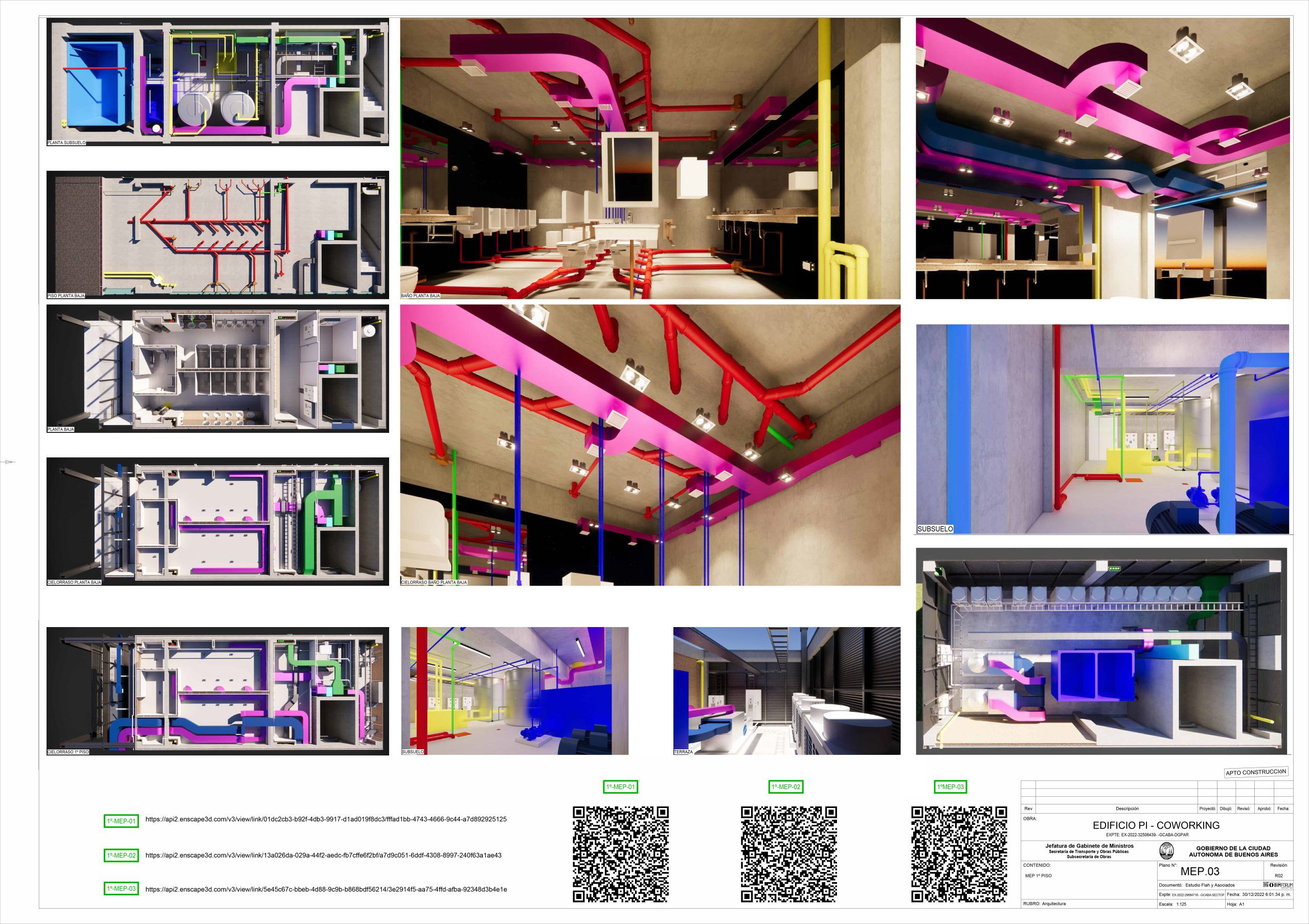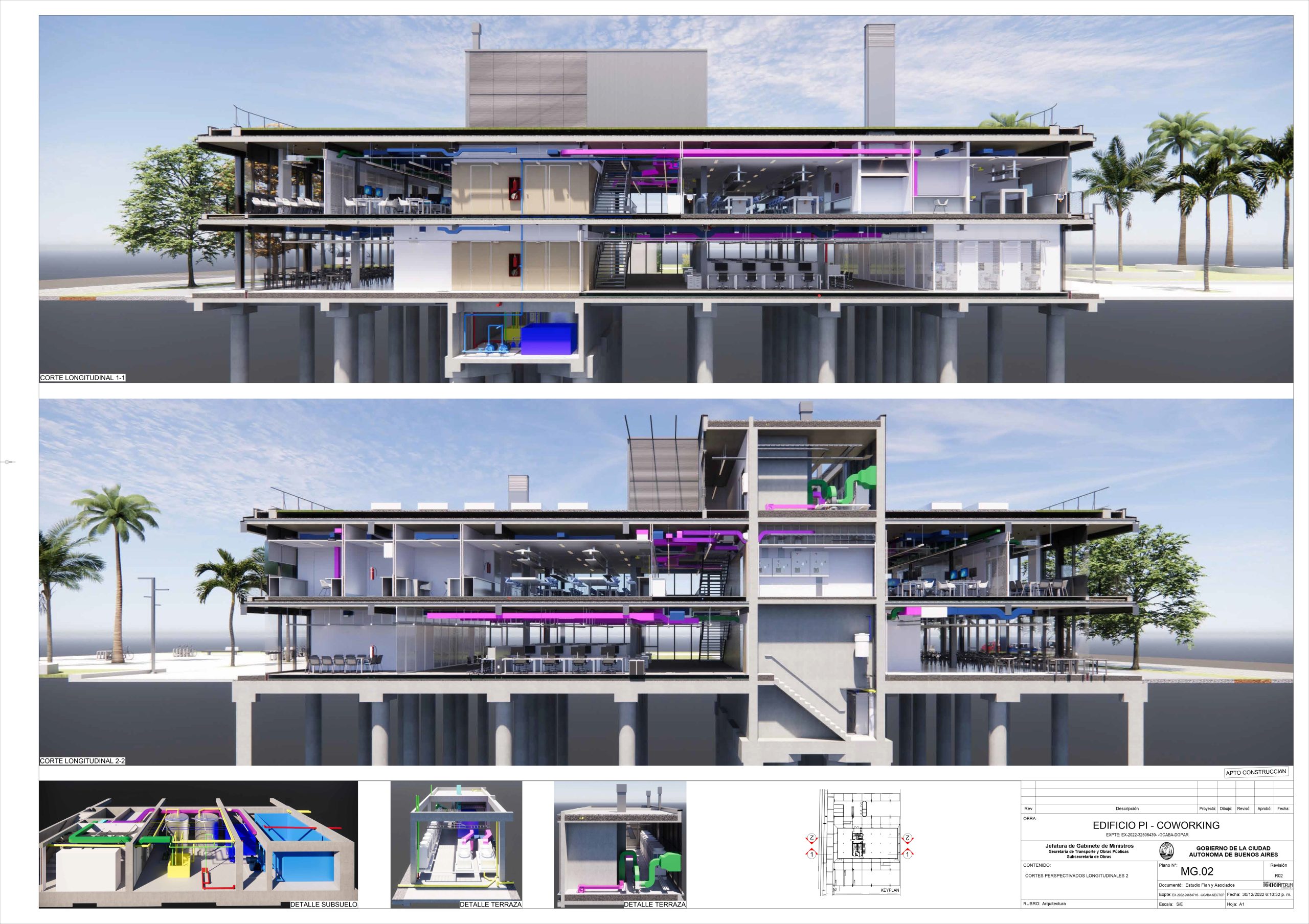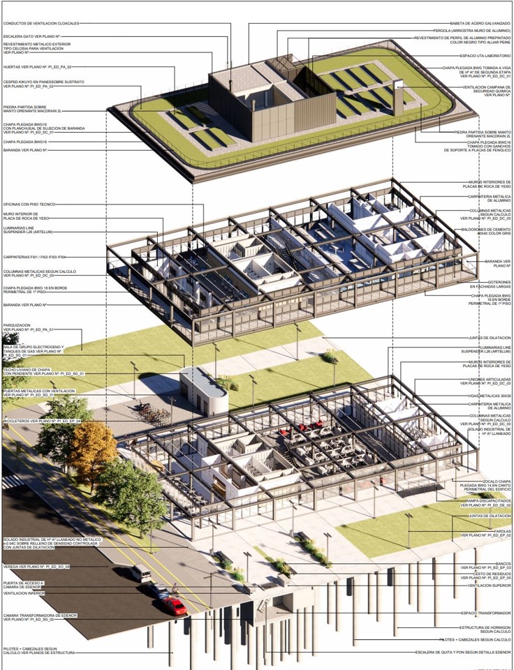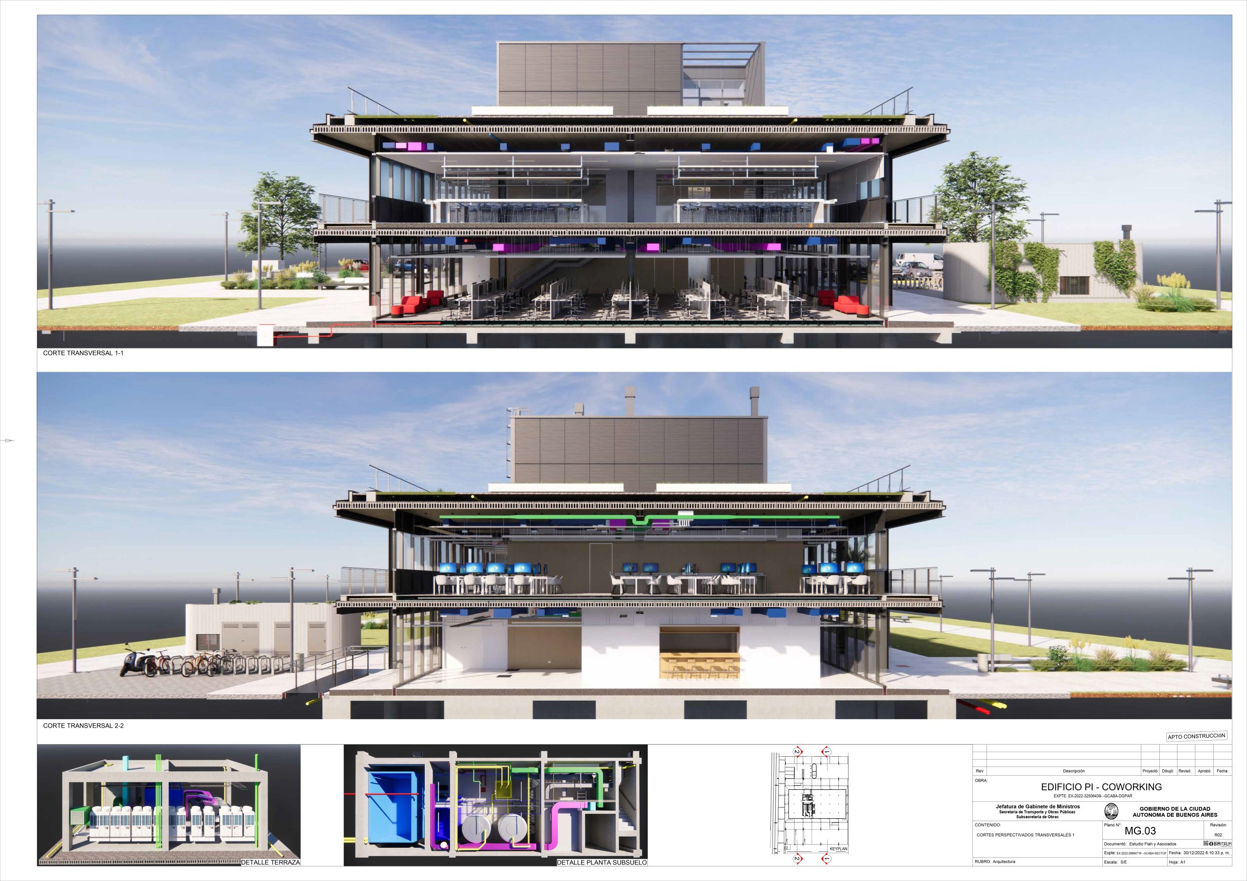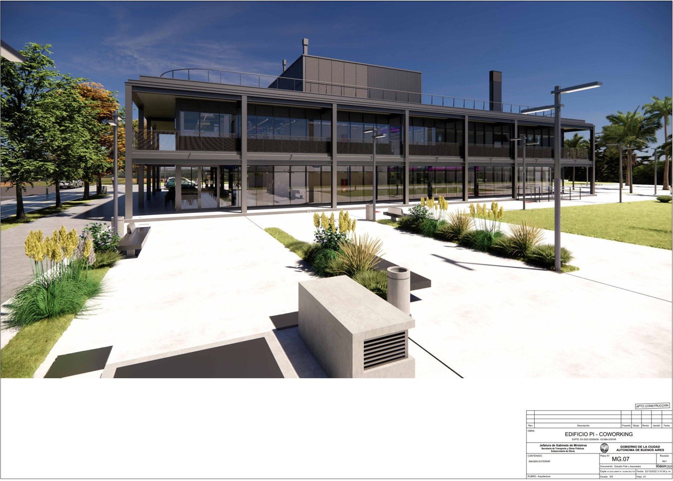 El Edificio PI prevé la construcción de un edificio de aproximadamente 1600m2 cubiertos (2200m2 de construcción), distribuidos en dos plantas, con subsuelo y terraza accesible, junto con la construcción de dos espacios públicos laterales para generar los espacios de esparcimiento y acceso necesarios para su escala.