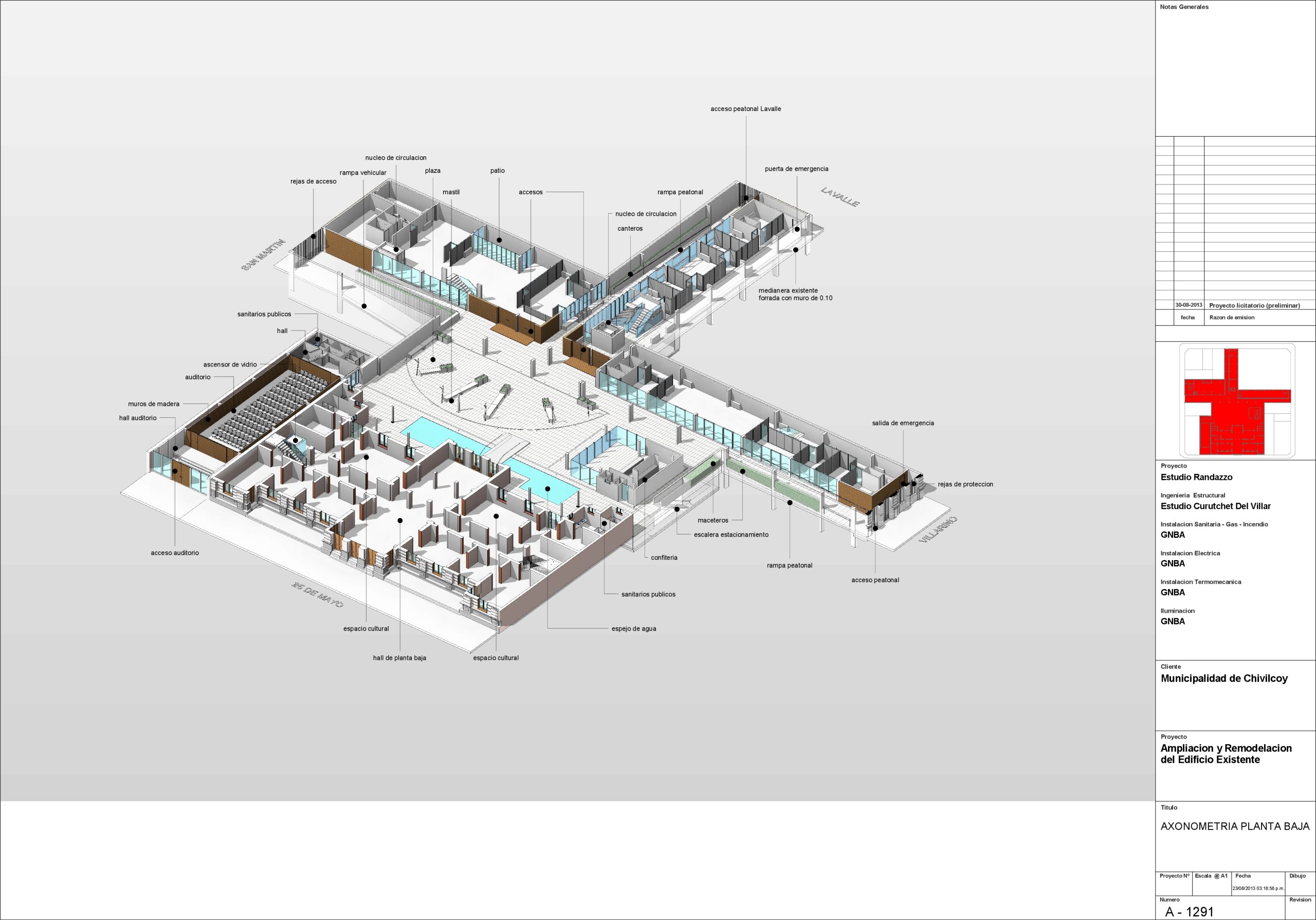 El planteo consistió en mantener y preservar el edificio existente convirtiéndolo en un gran Centro Cultural y un auditorio abierto a la comunidad con acceso desde el frente.